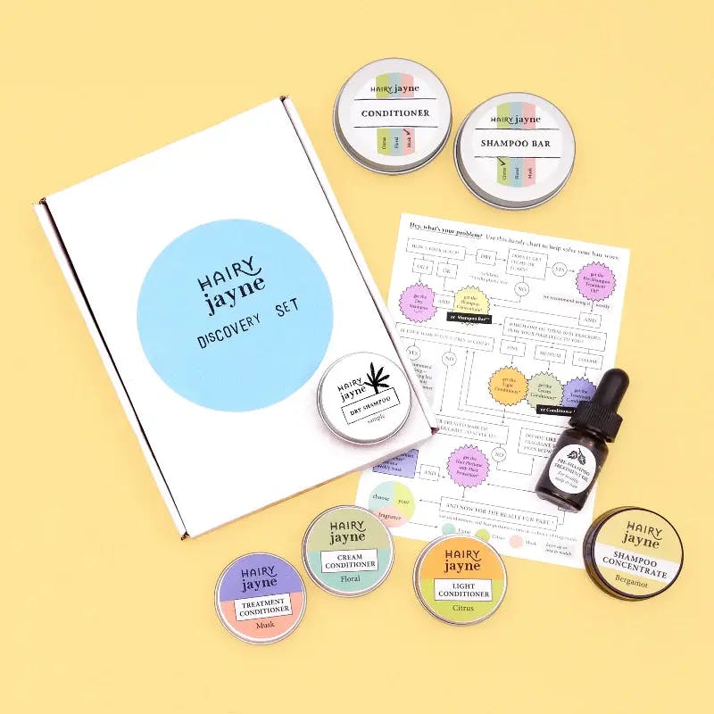 A great place to start for Hairy Jayne beginners. Set off on the right foot into the wonderful world of natural hair care with our Discovery Set. Try all of our vegan and zero waste shampoos and conditioners in your hair before committing to the full size. Also makes a great zero waste gift for anyone you'd like to introduce Hairy Jayne to.